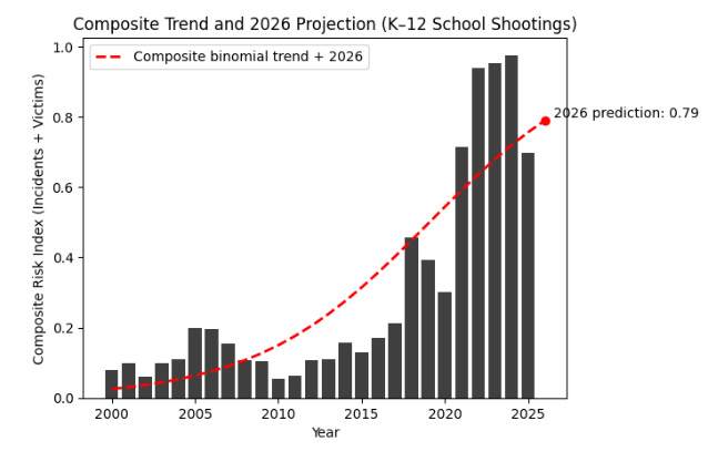 Below is a composite measure with an equal-weighted average of the yearly proportion of incidents classified as ‘active shooter’ and the yearly proportion of victims from those attacks. This measure combines how often active shooter incidents occur with how severe they are into a single normalized index. As you can see from the chart, this trend line has a significant upward trajectory (even with billions invested into fortifying schools).